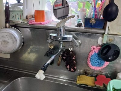 お客様から内容をお伺いしたところ、少し前に台所蛇口のスパウト部に鍋をあてて破損してしまい、しばらくテープで固定して使用していたが、最近になっていろんな箇所から水漏れしているので、蛇口交換をお願いしたいとの事でした。